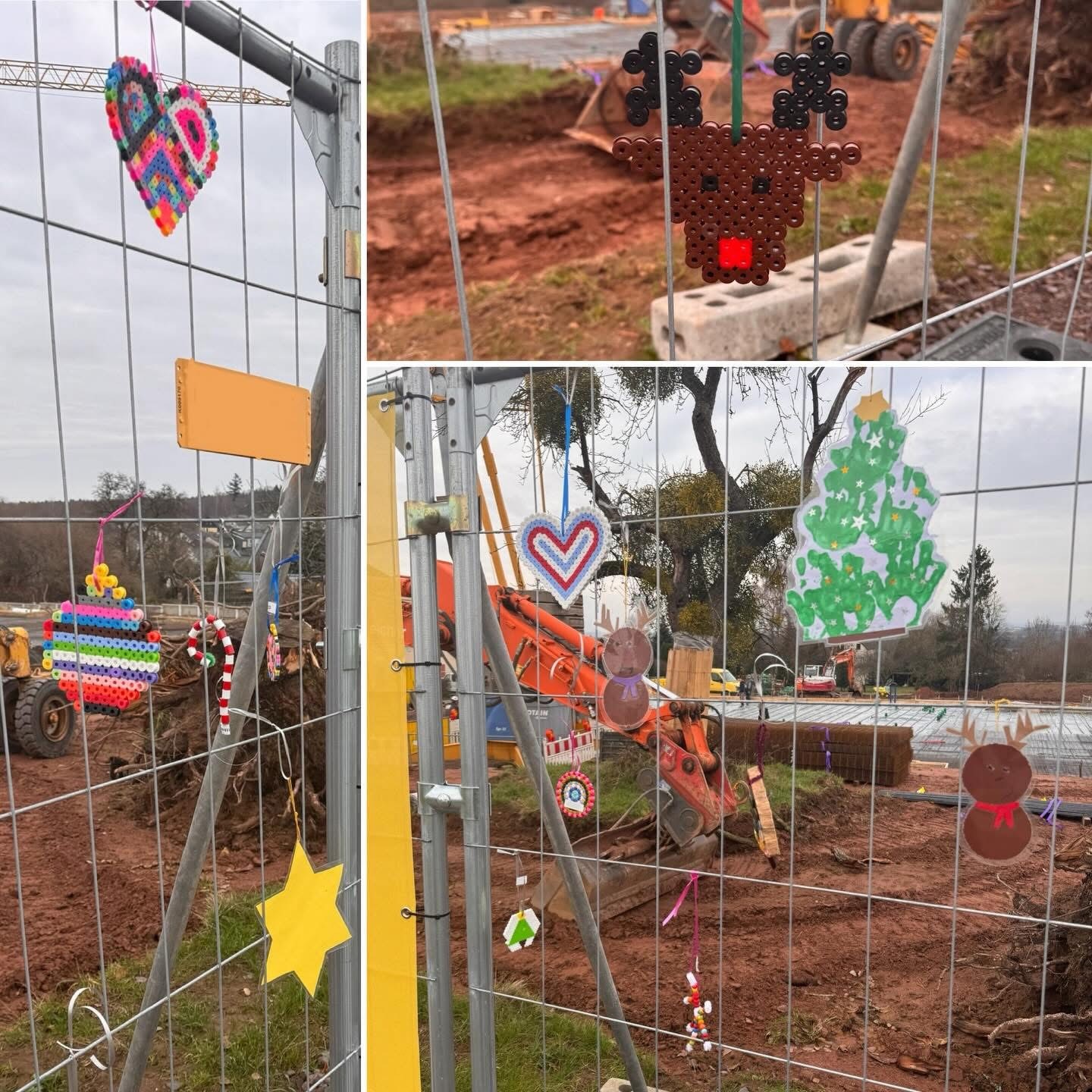 Doch dieses Jahr war den kleinen Künstlerinnen und Künstlern das nicht genug. Nachdem der Baum festlich glänzte, zog die fröhliche Truppe weiter – und zwar zur Baustelle der neuen Kita. Dort wurde der Bauzaun kurzerhand zur Leinwand erklärt. Mit bunten Bastelarbeiten und kindlicher Fantasie entstand ein echtes Highlight, das nicht nur die Dorfmitte verschönert, sondern auch den Alltag der Bauarbeiter. Die freuten sich sichtlich über diese ganz besondere „Baustellenverschönerung“.