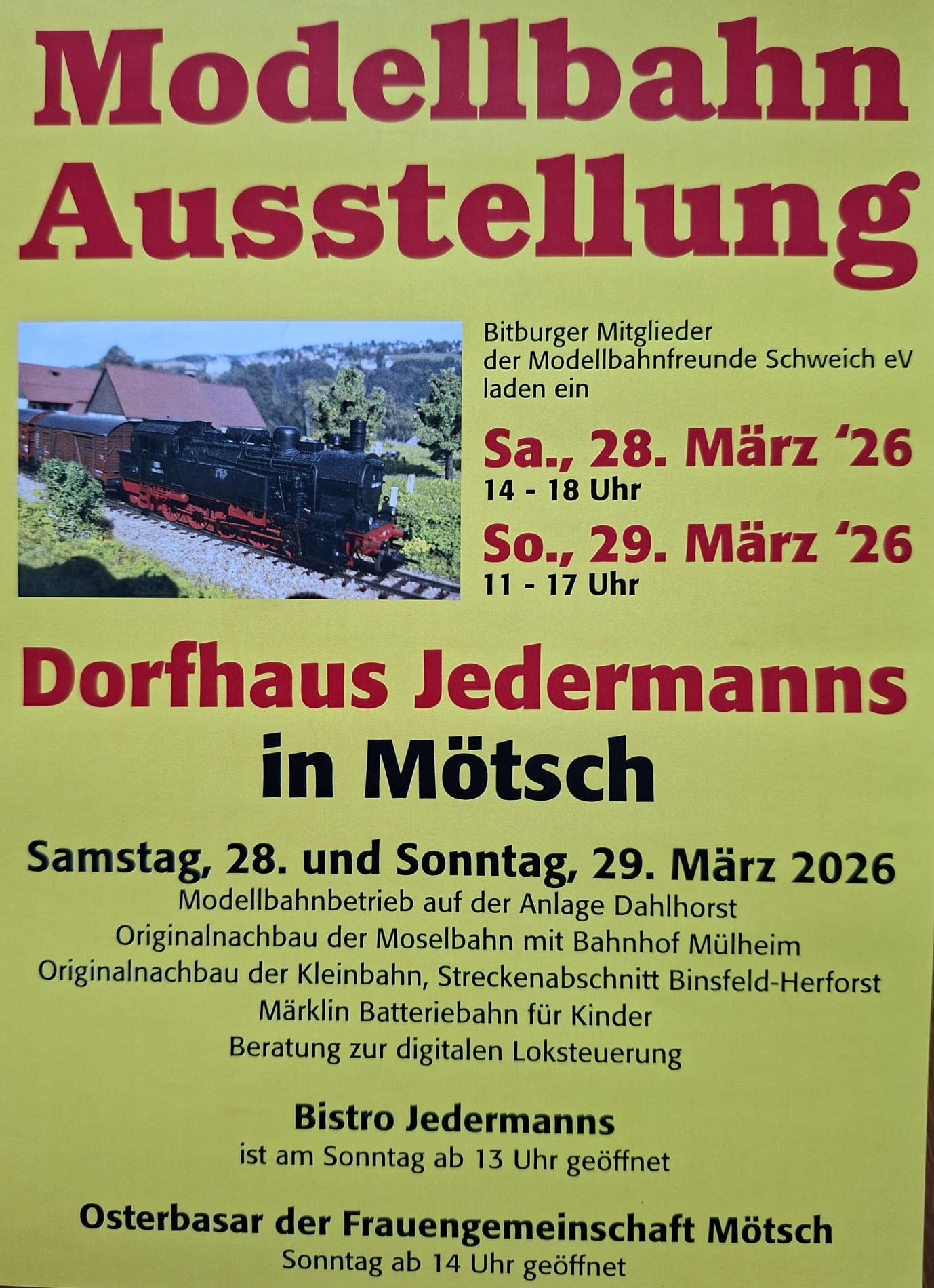 Die Ausstellung findet im Dorfhaus Jedermanns, Am Kindergarten 8, 54634 Bitburg-Mötsch statt. Sonntags ist das Bistro ab 13 Uhr geöffnet und die Frauengemeinschaft Mötsch lädt ab 14 Uhr zum Osterbasar. Infos zur Modellbahn über Herbert Schneider, Tel.:0160 551069, oder
